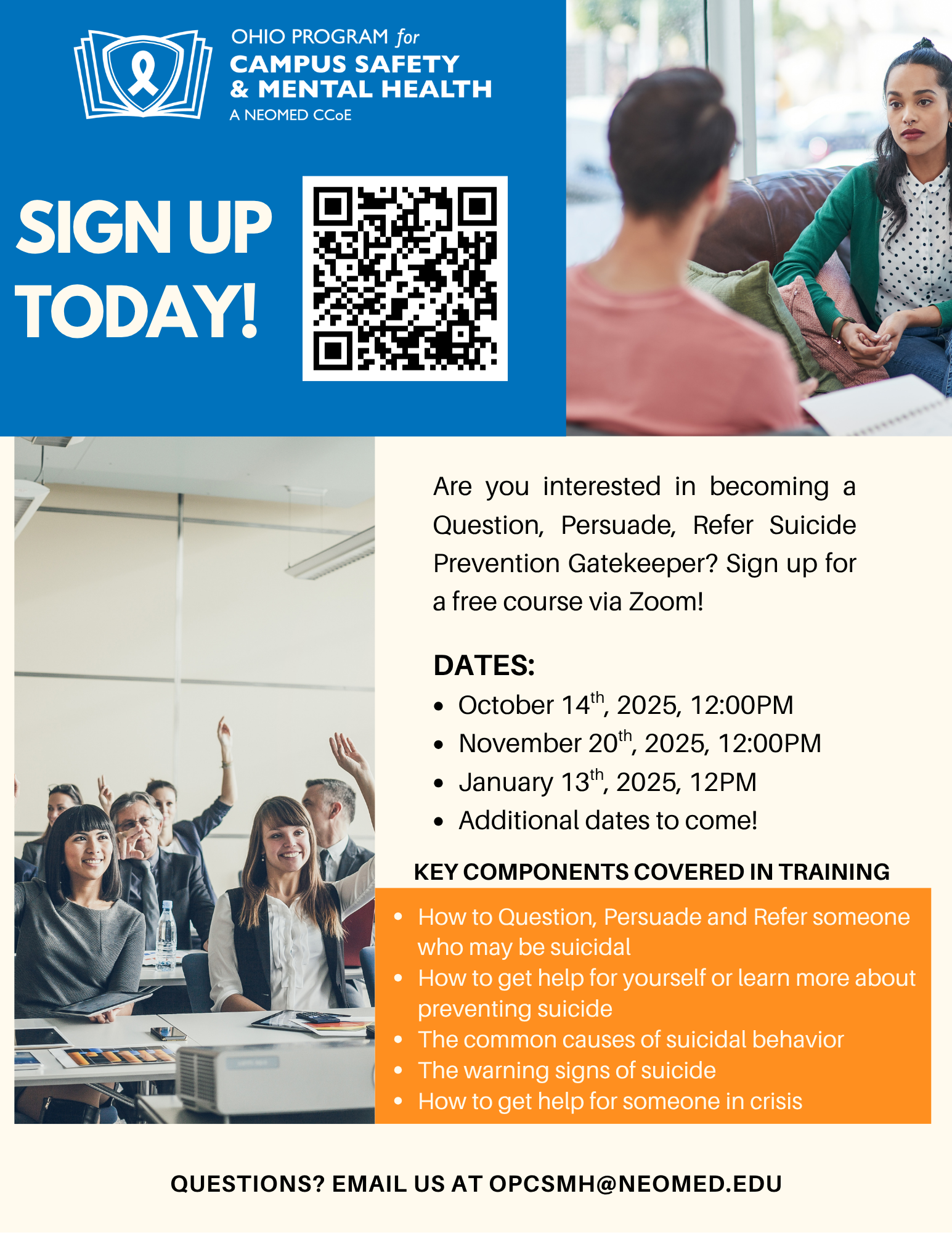 Interested in becoming a certified Question, Persuade, Refer (QPR) Suicide Prevention Gatekeeper? Sign up for a free session via Zoom today! Additional dates to come!