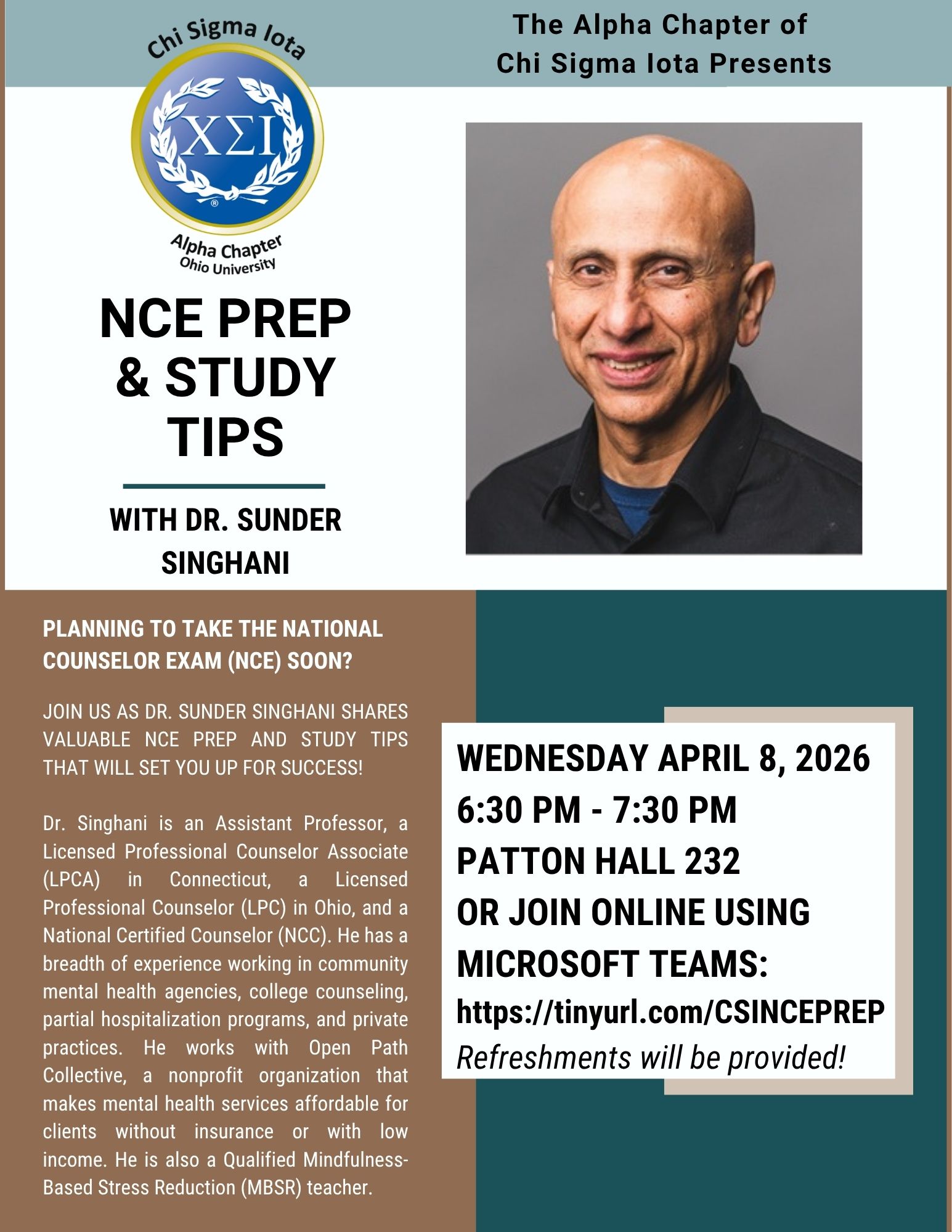 Next Wednesday, from 6:30-7:30pm, the Alpha Chapter of Chi Sigma Iota will welcome guest speaker Dr. Sunder Singhani as he presents on the National Counselor Examination (NCE). The insight and study tips provided by Dr. Singhani during this event will be an invaluable asset for students taking the NCE, and I highly recommend attending if you are planning to get your LPC licensure! The event will be offered both in-person at Patton Hall 232 and via Teams using the link below. Those attending in-person will be offered refreshments such as pizza and drinks. I have included a flyer below with more information about the event. Please let me know if you have any questions, and I look forward to seeing everyone next Wednesday!
