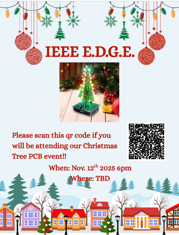 The IEEE EDGE Christmas Tree PCB Event has been postponed and will not be held today Wednesday the 12th. We plan on rescheduling it and will have a new flyer out when the time comes.